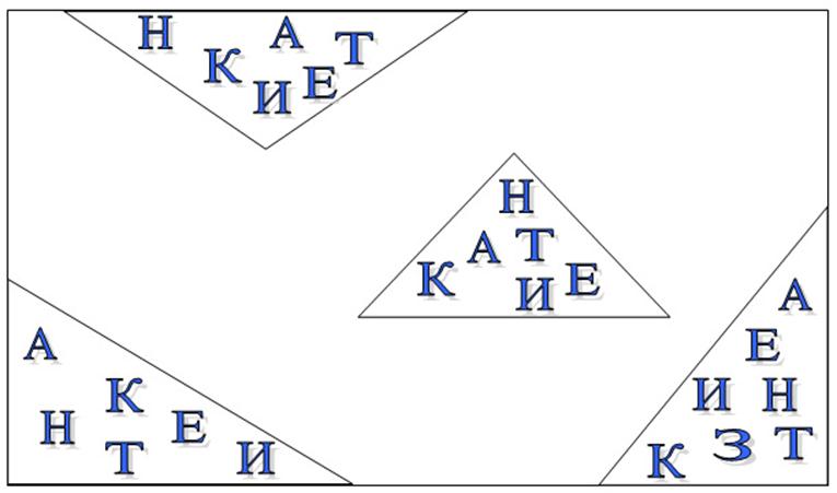 -Наше 1 задание будет таким: вы видите 4 треугольника, в них буквы. Найдите букву, которая написана только в одном треугольнике.