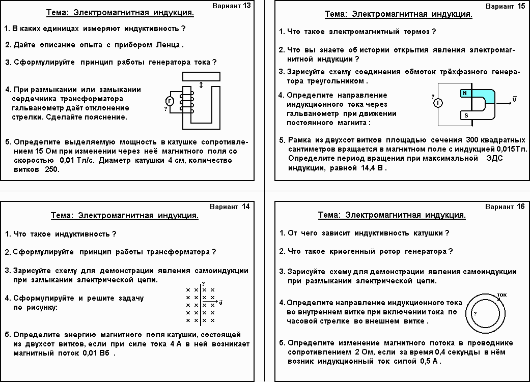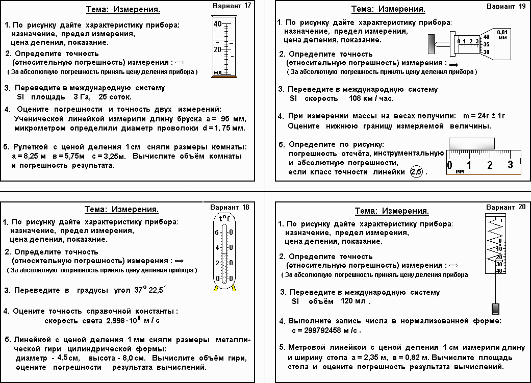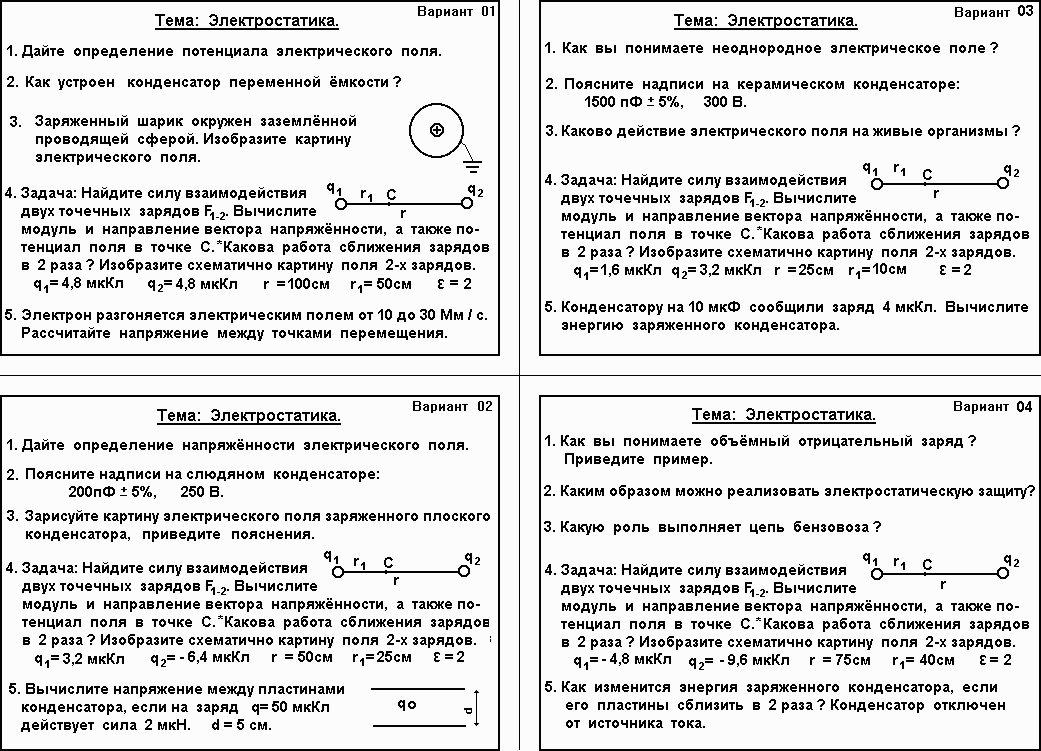 Вниманию преподавателей физики предлагается возможность ознакомиться с некоторыми вариантами карточек по разделам «Электростатика», «Основы кинематики», «Законы постоянного тока». «Электромагнитная индукция», «Измерения и погрешности».