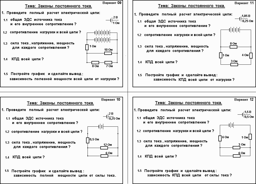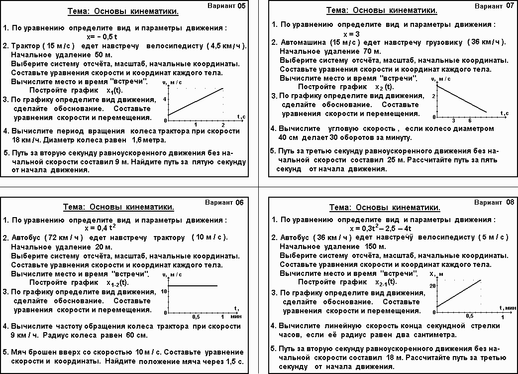 Карточки могут быть использованы в полном объёме или частично при разных формах зачётов в классе, как контрольную работу по всему разделу, для домашних работ и дополнительных заданий на практических занятиях. Преподаватель самостоятельно определяет количество баллов за каждое задание с учётом их сложности. В разных разделах курса физики подход к формированию заданий в карточках может значительно отличаться. Это уже выбор преподавателя. К примеру, в карточках по кинематике нет резона ставить вопросы из теории; лучше, если ученик покажет умение самостоятельно выбрать направление и масштаб координатной оси, наметит способ отсчёта времени, определит начальные условия и составит уравнения движения, а также построит график. Следующее задание – обратного типа: по графику движения составить уравнения и т.д. Другой пример можно привести по разделу «Законы постоянного тока». Здесь можно предложить вариант одной задачи, состоящей из взаимосвязанных заданий нарастающей сложности. Каждый раздел физики имеет свои объективные особенности и их надо учитывать.
