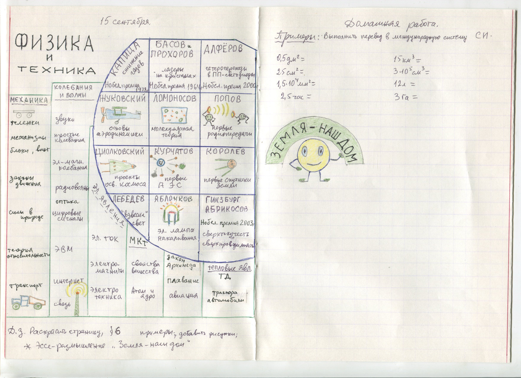 Необходимо обратить внимание преподавателей на очень важный и, может быть, даже главный момент каждого урока: работа учеников в рабочих тетрадях должна отражать записи на классной доске. Исходя из принципа информационной ёмкости, удобно планировать и размещать материал одного урока на развороте классной доски и, соответственно, тетради ученика (всё основное, что озвучивается и показывается). Классная доска и тетради учеников заполняются постепенно в течении всего урока. На мой взгляд, полезно приучать детей выстраивать ответ по вопросу так, чтобы в нём была понятна суть самого вопроса. Очень желательно рядом со схемой опыта записывать выводы. В решении задач полезно во всех классах, включая и старшую школу, делать комментарии. На уроках в 7 классе (и не только) можно делать заготовки домашней работы на том же развороте, где и классная работа. В целом, это даёт возможность наглядно анализировать учителю и родителям работу ученика. С такими тетрадями легко организовать повторение на протяжении всего учебного года и начало следующего. Все эти идеи опираются на рекомендации психологов: память хранит информацию, преобразованную в образы; деловое участие в обучении становится личностно значимым.