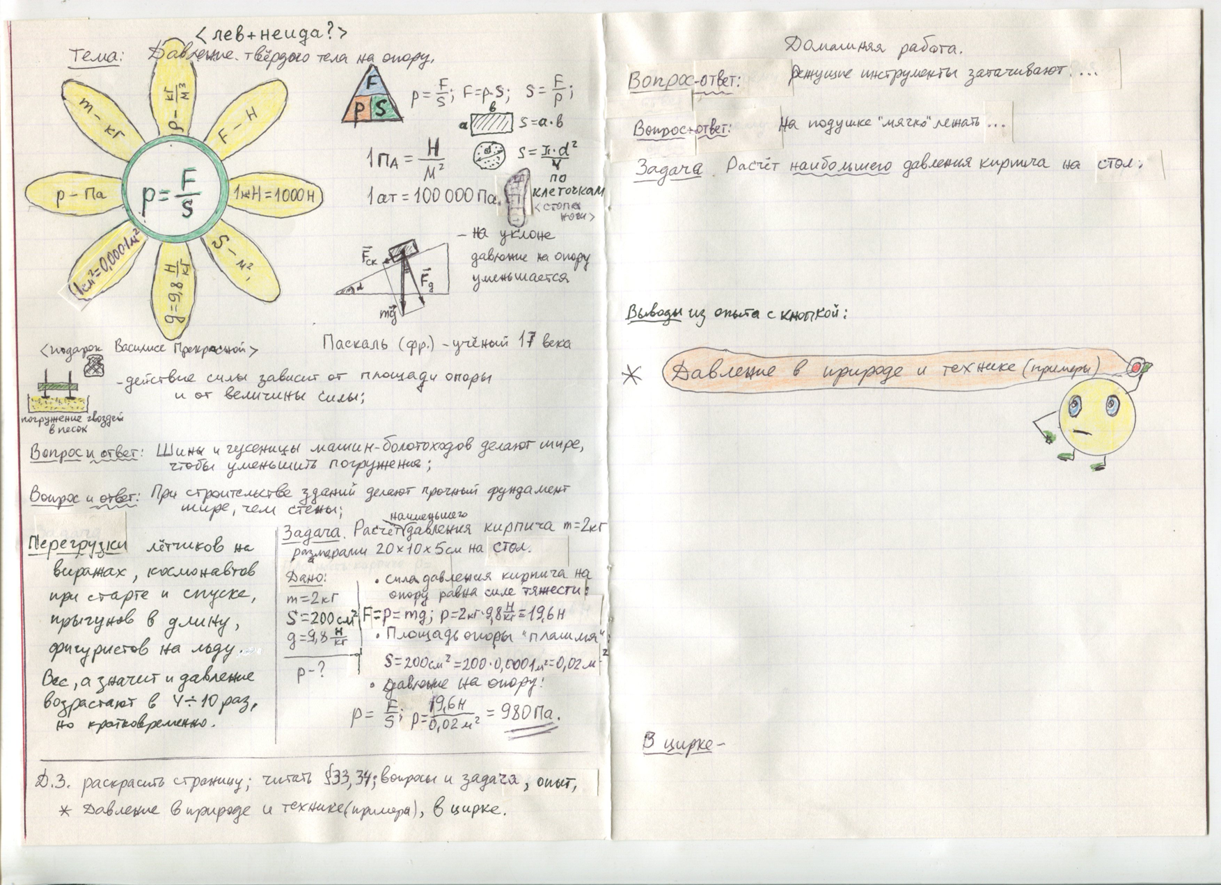Вниманию читателей предлагается две модели уроков в 7 классе. Вот так выглядят записи и зарисовки учеников в своих тетрадях на окончание урока. Нетрудно увидеть, какие игровые моменты были использованы, как проходила актуализация знаний, о чём шёл разговор, что главное почерпнули ученики и многое другое. Так, на уроке по давлению тема урока заявлена как загадка перестановки букв (лев+неида). В игровой форме (готовили подарок Василисе Премудрой или Прекрасной) провели повторение. На уроке проведены эксперименты с погружением тела в песок и был дан анализ уменьшения давления на опору бруска на уклоне. «Полуфабрикаты» домашних заданий показывают уровневый подход: что делать по образцу, а что со звёздочкой – по желанию поработать с добавочной литературой или в интернете. Для самых ленивых «затравка» – разрисовать страницу. Презентацию урока делают дети и преподаватель вместе, не отходя от своего «рабочего станка», а это и есть главное в нашей деятельности. Вторую модель урока – «Физика и техника», предлагаю читателям этой статьи проанализировать самостоятельно. Обратите внимание, что вертикальные столбики показывают в «оглавлении» разделы курса физики.